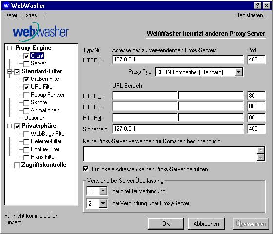 - Tragen Sie in Ihrem Browser den Webwasher als Proxy ein. In der Regel geschieht dies durch den Eintrag 127.0.0.1:8080 (8080 ist der Port, den Webwasher nutzt).